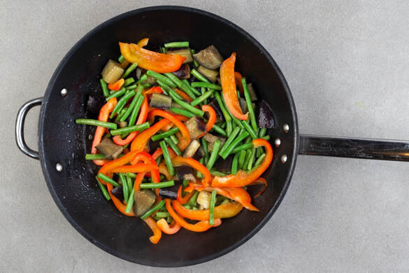Die Paprika jeweils vierteln, entkernen und in dünne Streifen schneiden. Die Paprika und die Bohnen mit je 1 kräftigen Prise Salz und Pfeffer in die Pfanne zu den Auberginen geben und 6–8Min. braten.