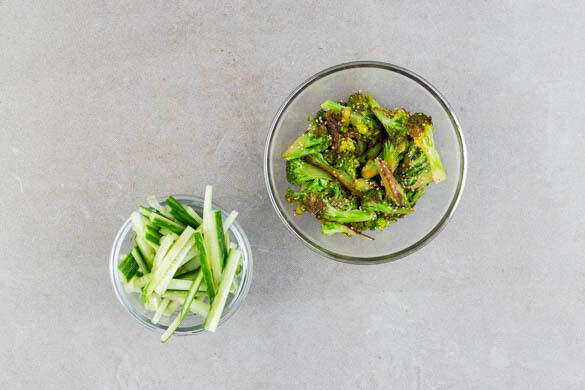 Das Sesamöl mit 1EL Essig, 1EL Wasser und 1 Prise Salz zu einem Dressing verrühren. Die ½ des Dressings mit dem Sesam und dem gebratenen Brokkoli vermengen. Mit dem restlichen Dressing die Gurken beträufeln.