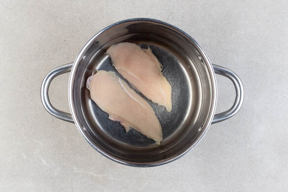 Den Backofen auf 220°C (200°C Umluft) vorheizen. In einem mittelgroßen Topf ausreichend gesalzenes Wasser für das Fleisch zum Kochen bringen. Das Fleisch trocken tupfen, in das kochende Wasser geben und in 8–10Min. gar kochen.
