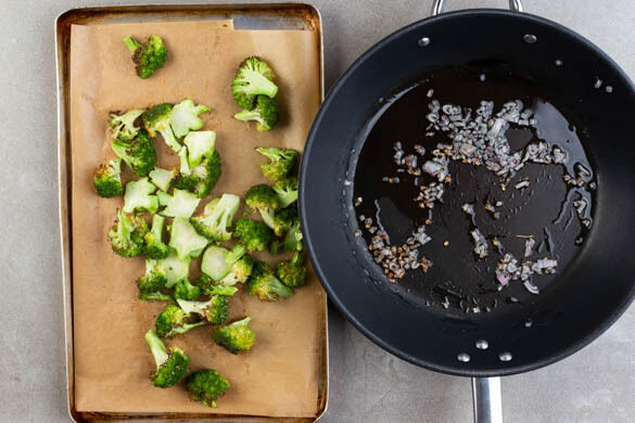 Den Brokkoli im Ofen 12–16Min. rösten, bis die Ränder knusprig werden. Die Schalotten in einer großen Pfanne mit 2EL Olivenöl bei mittlerer Hitze ca. 3Min. glasig anbraten.