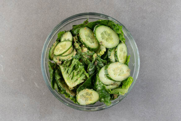 Die Pilze und die restlichen Hefeflocken mit 1EL Pflanzenöl und einer kräftigen Prise Salz in einer großen Pfanne bei mittlerer bis starker Hitze 5–7Min. anbraten, bis die Pilze weich und appetitlich gebräunt sind. Inzwischen die Gurke in dünne Scheiben schneiden. Den Romanasalat in mundgerechte Stücke zupfen.