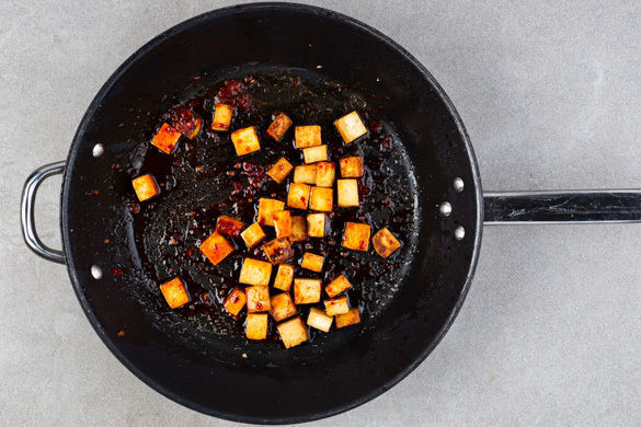 Den Ahornsirup und die Chilipaste nach Geschmack zum Tofu in die Pfanne geben und ca. 1Min. unterrühren, bis der Tofu leicht klebrig überzogen ist. Tipp: Die Chilipaste ist sehr scharf, daher besser erst wenig verwenden und ggf. nachwürzen.