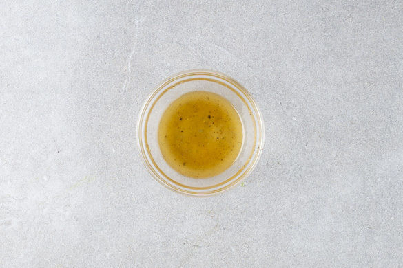 Das Sesamöl mit 2TL Pflanzenöl, 2TL Essig sowie Salz und Pfeffer nach Geschmack zu einem Dressing verrühren.