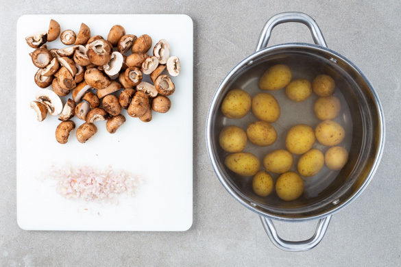Den Backofen auf 220°C (200°C Umluft) vorheizen. In einem mittelgroßen Topf ausreichend gesalzenes Wasser für die Kartoffeln zum Kochen bringen. Die Kartoffeln samt Schale im kochenden Wasser 8–12Min. vorkochen. Die Schalotte schälen, halbieren und fein würfeln. Die Pilze ggf. säubern und je nach Größe halbieren oder vierteln.