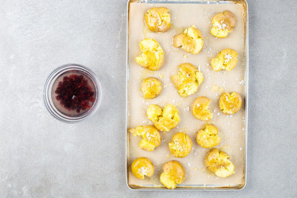 Die Kartoffeln in ein Sieb abgießen und auf ein mit Backpapier ausgelegtes Backblech geben. Mit der Unterseite des Topfes leicht platt drücken und mit 1EL Olivenöl sowie 1 Prise Salz vermengen, dann im Ofen ca. 15Min. backen. Die Cranberrys in 50ml heißem Wasser einweichen.