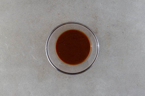 Die Stärke mit der Teriyakisauce, der Sojasauce, 150ml Wasser, 1 kräftigen Prise Salz und 1 Prise Pfeffer verrühren.