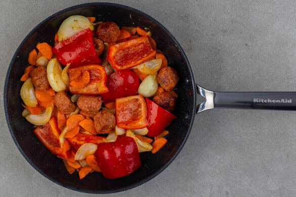 Die Paprika, die Karotten, die Zwiebeln, den Ingwer und den Knoblauch in die Pfanne geben und bei mittlerer Hitze 4–6Min. mitbraten, bis das Gemüse leicht gebräunt ist, aber noch Biss hat.
