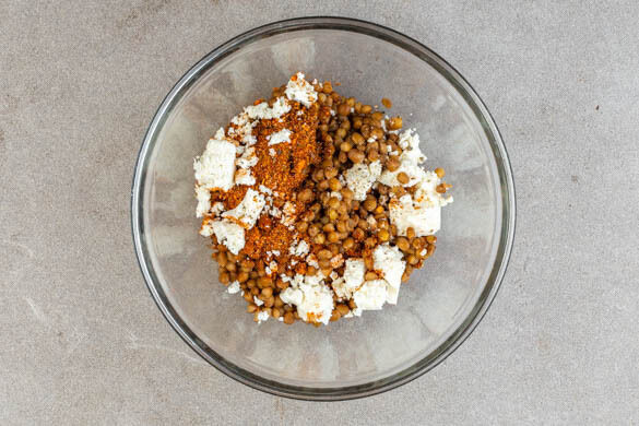 Inzwischen die Linsen in einem Sieb mit kaltem Wasser abspülen und abtropfen lassen. Den Feta mit den Fingern oder einer Gabel zerkrümeln und die ½ des Fetas mit den Linsen, der Gewürzmischung und je 1 kräftigen Prise Salz und Pfeffer vermengen.