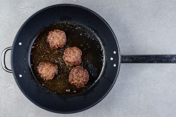 Die Frikadellen in einer großen Pfanne mit 2EL Olivenöl bei mittlerer bis starker Hitze in 6–8Min. rundum goldbraun und gar braten. Aus der Pfanne nehmen und beiseitestellen.