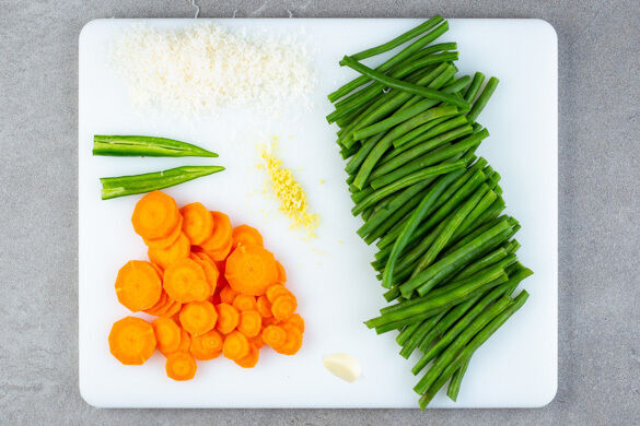 Die Enden der Bohnen entfernen. Die Karotte ggf. schälen und in dünne Scheiben schneiden. Den Ingwer schälen und fein würfeln oder reiben. Den Knoblauch schälen. Die Peperoni längs halbieren. Tipp: Für weniger Schärfe die Kerne entfernen. Den Käse fein reiben.
