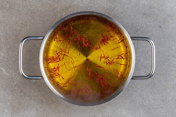 In einem mittelgroßen Topf 600ml leicht gesalzenes Wasser mit dem Safran zum Kochen bringen.