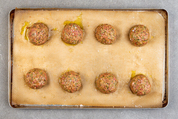 Das Hackfleisch mit den Händen gut durchkneten und zu 8 golfballgroßen Bällchen formen. Die Hackbällchen auf einem mit Backpapier ausgelegten Backblech verteilen, mit 1EL Olivenöl beträufeln und 20–25Min. im Ofen backen.