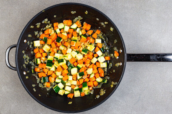 Die Karotte ggf. schälen, längs vierteln und in grobe Würfel schneiden. Die übrige Zucchini ebenfalls längs vierteln und grob würfeln. Die Zwiebel schälen, halbieren und fein würfeln. Den Knoblauch schälen und grob würfeln. Die Zwiebeln, den Knoblauch und das Gemüse in einer mittelgroßen Pfanne mit 1EL Olivenöl bei mittlerer bis starker Hitze in 8–10Min. weich braten.