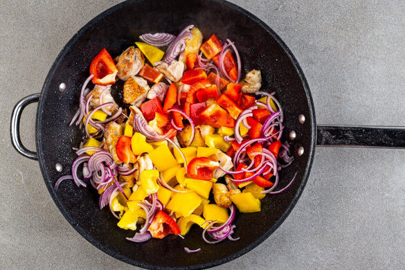 Das Fleisch in einer großen Pfanne mit 1EL Butter bei mittlerer bis starker Hitze 2–3Min. anbraten, dabei nur wenig umrühren. Die Paprika und die Zwiebeln hinzufügen und ca. 5Min. mitbraten, bis das Gemüse weich und das Fleisch gar ist.