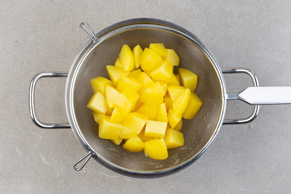 In einem mittelgroßen Topf ausreichend gesalzenes Wasser für die Kartoffeln zum Kochen bringen. Die Kartoffeln schälen und in 3–4cm große Würfel schneiden, dann in das Wasser geben (es muss noch nicht kochen) und in 12–14Min. weich garen. In ein Sieb abgießen und abtropfen lassen.