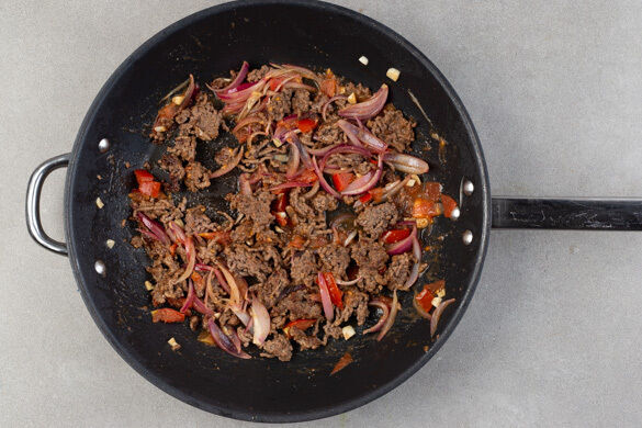 Das Hackfleisch in einer mittelgroßen Pfanne mit 1EL Pflanzenöl und 1 Prise Salz bei starker Hitze ca. 2Min. anbraten, bis es leicht gebräunt ist.