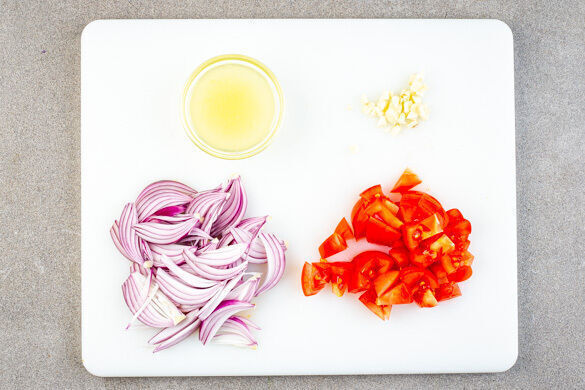 Die Zwiebeln schälen, halbieren und in dünne Spalten schneiden. Den Knoblauch schälen und grob würfeln. Die Tomaten in kleine Würfel schneiden. Die Zitronen halbieren und auspressen.