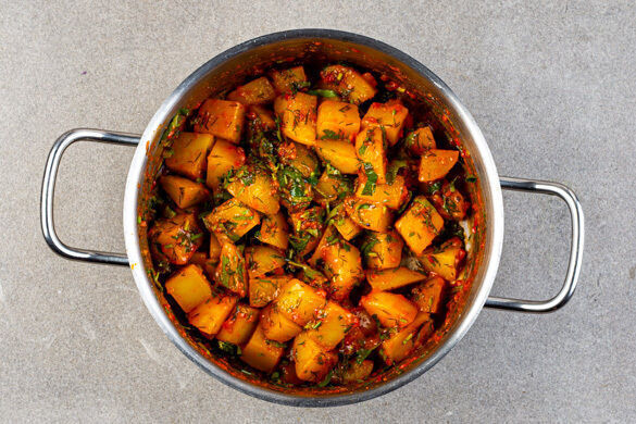 In einem mittelgroßen Topf ausreichend gesalzenes Wasser für die Kartoffeln zum Kochen bringen. Die Kartoffeln schälen und in 3–4cm große Würfel schneiden, dann in das Wasser geben (es muss noch nicht kochen) und in 12–14Min. weich garen. In ein Sieb abgießen und abtropfen lassen.