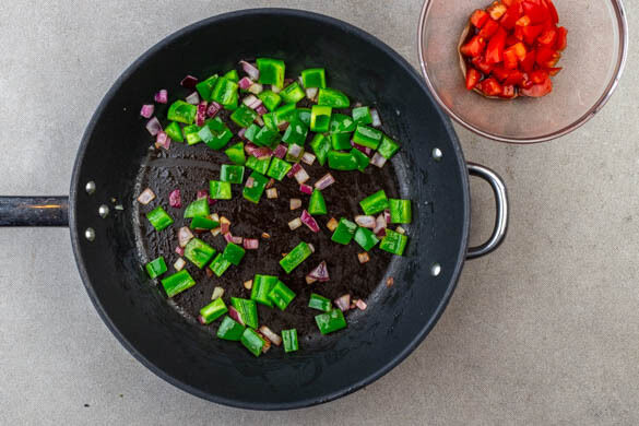 Die Paprika und die Zwiebeln in einer mittelgroßen Pfanne mit 1EL Olivenöl bei mittlerer Hitze ca. 5Min. braten, bis sie weich und glänzend sind. Währenddessen in einer Salatschüssel ½EL Olivenöl und 1TL Balsamicoessig zu einem Dressing verrühren. Die Tomate grob schneiden und mit dem Dressing vermengen.