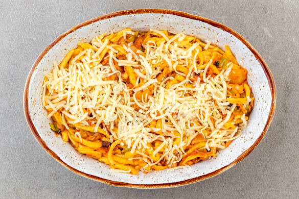 Eine mittelgroße Auflaufform mit ½EL Olivenöl fetten. Die Spätzle, das Gemüse und die ½ des Käses in die Auflaufform geben und gut vermengen. Den restlichen Käse darüber verteilen und im Ofen ca. 15Min. backen, bis der Käse zerlaufen ist. Den Grill dazuschalten oder die Hitze auf 250°C erhöhen und die Spätzle im oberen Ofendrittel in ca. 5Min. goldbraun und knusprig backen.