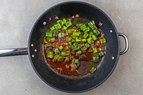 Das Brühgewürz, 200ml Wasser und die restliche Gewürzmischung in die Pfanne geben und einmal aufkochen lassen, dann bei niedriger Hitze unter gelegentlichem Rühren 6–8Min. köcheln lassen.