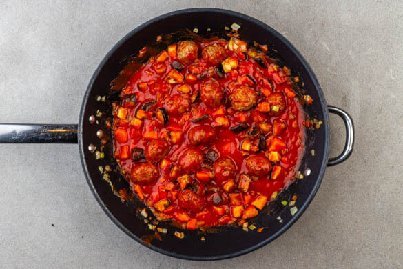 Wenn das Gemüse ca. 10Min. gebraten hat, die Hackbällchen und die Auberginen dazugeben 2–3Min. mitbraten, bis die Hackbällchen vollständig durcherhitzt sind. Die passierten Tomaten zugeben und einmal aufkochen lassen. Dann die Hitze reduzieren und die Sauce bis zum Servieren sanft köcheln lassen.