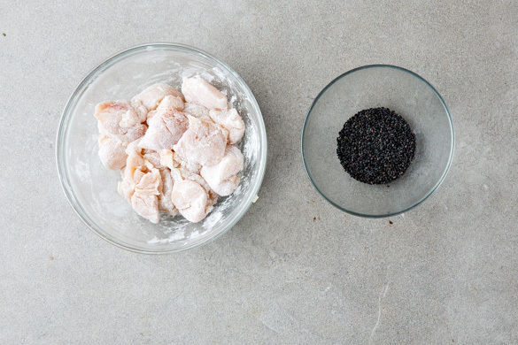 Das Fleisch trocken tupfen, in 2–3cm große Würfel schneiden und mit 1EL Mehl und 1 Prise Salz vermengen. Anschließend das Fleisch in einer großen Pfanne mit 1EL Pflanzenöl bei mittlerer bis starker Hitze in 4–6Min. goldbraun anbraten. Die Hitze reduzieren, ½EL Honig unterrühren und das Fleisch auf einem Teller beiseitestellen. Die Pfanne aufbewahren.