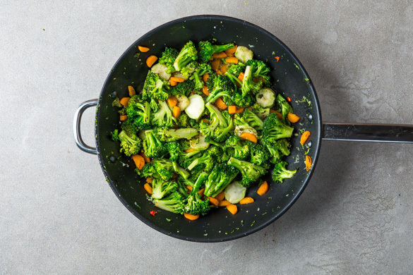 Die Chilischote längs halbieren, entkernen und in feine Streifen schneiden. Den Ingwer schälen und fein reiben. Die Karotten und den Brokkoli in der Pfanne mit 1EL Pflanzenöl bei starker Hitze 2–3Min. anbraten. Mit 150ml Wasser ablöschen, dann den Ingwer, den Knoblauch und die ½ der Chilistreifen unterrühren und 2–3Min. mitköcheln.