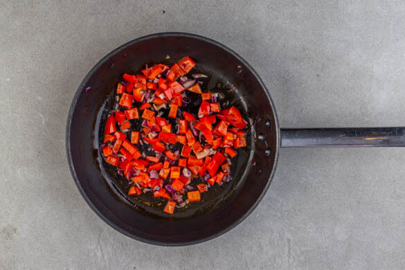 Den Backofen auf 240°C (220°C Umluft) vorheizen. Die Zwiebeln schälen, eine Zwiebel halbieren und in dünne Streifen schneiden, die andere Zwiebel grob würfeln. Die Paprika vierteln, entkernen und in ca. 2cm große Würfel schneiden. Die Zwiebelwürfel und die Paprika in einer großen Pfanne mit 1½EL Olivenöl bei mittlerer Hitze ca. 5Min. braten, bis sie weich werden.
