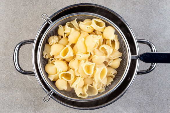 Die Pasta in das kochende Wasser geben und in 9–11Min. bissfest kochen. Mit einem Messbecher ca. 250ml Pastawasser abschöpfen, dann die Pasta in ein Sieb abgießen und abtropfen lassen.