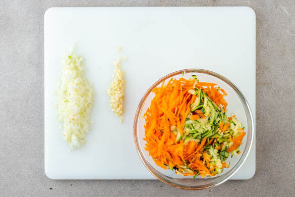 Die Karotte ggf. schälen. Die Karotte und die Zucchini grob raspeln. Die Gemüseraspel mit 1 kräftigen Prise Salz vermengen, in ein sauberes Geschirrtuch wickeln und gut auswringen, um möglichst viel Flüssigkeit zu entfernen. Die Zwiebel schälen, halbieren und grob würfeln. 1 Knoblauchzehe schälen und fein würfeln.