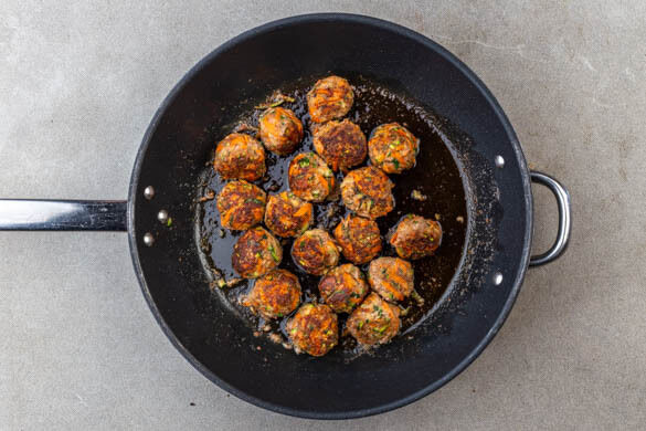 Die Zwiebeln in derselben Pfanne mit 1EL Olivenöl bei mittlerer Hitze in 2–3Min. glasig anbraten. Den Knoblauch und die Gewürzmischung zugeben und ca. 1Min. mitbraten. Das Tomatenmark, 1TL Brühgewürz und 300ml Wasser zugeben und zum Kochen bringen, dann die Hitze reduzieren und ca. 5Min. köcheln lassen. Die Hackbällchen in die Sauce geben und ca. 5Min. mitgaren.