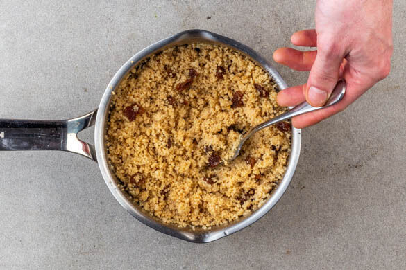 In einem kleinen Topf 300ml leicht gesalzenes Wasser zum Kochen bringen. Währenddessen die Minze- und Petersilienblätter von den Stängeln zupfen und fein hacken. Die Petersilienstängel fein schneiden. Den Topf vom Herd nehmen, den Couscous, ½TL Brühgewürz und die Rosinen ins Wasser rühren und abgedeckt 6–8Min. quellen lassen.