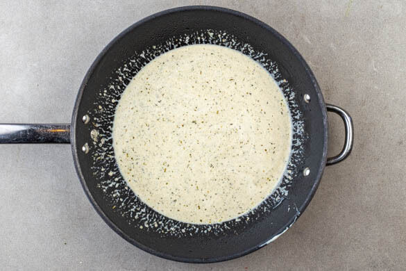 Die Gewürzmischung mit 2EL Butter in der Pfanne bei niedriger Hitze ca. 30Sek. anbraten, dann die Crème fraîche und 100ml Wasser zugeben und die Sauce 1–2Min. köcheln lassen. Mit Salz und Pfeffer abschmecken.