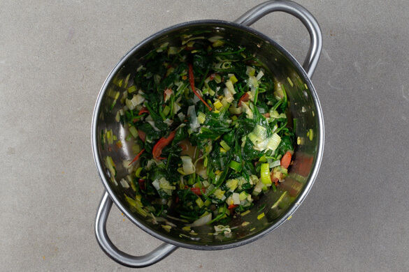 Den übrigen Lauch in einem großen Topf mit 2EL Olivenöl bei starker Hitze 1–2Min. anbraten. Die Tomaten, den Knoblauch, den Spinat und den Orangensaft unterrühren und das Gemüse noch ca. 1Min. abgedeckt garen, bis der Spinat zusammengefallen ist, mit Salz und Pfeffer abschmecken. Den Fisch mit den Auberginen und dem Spinatgemüse anrichten und servieren.