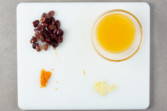 Die Orangenschale fein abreiben, dann die Orange halbieren und auspressen. Die Oliven grob hacken. Den Knoblauch schälen und fein würfeln.