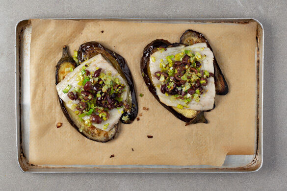 Den Fisch kalt abspülen, trocken tupfen und evtl. vorhandene Gräten mit einer Pinzette entfernen. Dann auf die Auberginen legen, mit der Gremolata bestreichen und 7–9Min. im Ofen backen, bis der Fisch gar ist.
