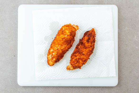 Das Fleisch der Reihe nach im Mehl, in der Senf-Milch-Mischung und im Paniermehl wenden. Darauf achten, dass alles gleichmäßig bedeckt ist, die Panade ggf. noch leicht andrücken. Die Schnitzel in einer mittelgroßen Pfanne mit 2EL Pflanzenöl bei mittlerer Hitze auf jeder Seite 3–4Min. braten, bis die Panade goldgelb und knusprig ist, dann auf Küchenkrepp abtropfen lassen.