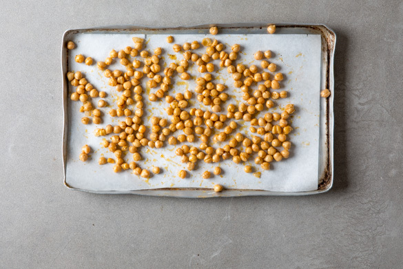 Den Backofen mit Grillfunktion oder Ober-/Unterhitze auf 250°C vorheizen. Die Kichererbsen in einem Sieb abtropfen lassen, dann auf einem mit Backpapier ausgelegten Backblech mit 1EL Olivenöl und der Gewürzmischung vermengen. Gleichmäßig verteilen und 8–10Min. im oberen Drittel des Ofens grillen, bis die Kichererbsen goldbraun und leicht knusprig sind. Abkühlen lassen.