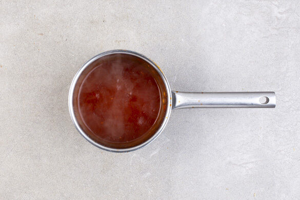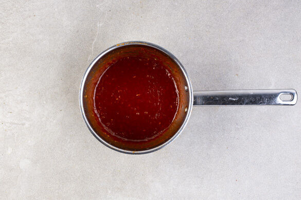 1EL Speisestärke mit 2–3EL kaltem Wasser verrühren, dann in die Sauce rühren. Die Sauce weitere 5–6Min. bei mittlerer Hitze köcheln und eindicken lassen. Mit Salz und ggf. mehr Honig und/oder Essig abschmecken.