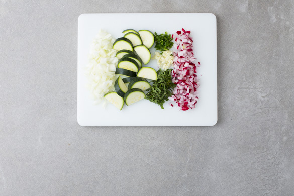 Die Zucchini halbieren und in dünne Scheiben schneiden. Die Zwiebel schälen und grob würfeln. Den Knoblauch schälen und ebenfalls würfeln. Die Chilischote längs halbieren, entkernen und fein schneiden. Die Minzeblätter von den Stängeln zupfen und in feine Streifen schneiden. Die Radieschen grob würfeln.
