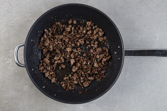 In einem mittelgroßen Topf ausreichend gesalzenes Wasser für die Pasta zum Kochen bringen. Das Hackfleisch in einer großen Pfanne mit 1TL Olivenöl bei mittlerer Hitze 4–5Min. goldbraun braten. Nach Belieben mit Salz und Pfeffer würzen, dann aus der Pfanne nehmen und auf einem Teller beiseitestellen. Die Pfanne aufbewahren.