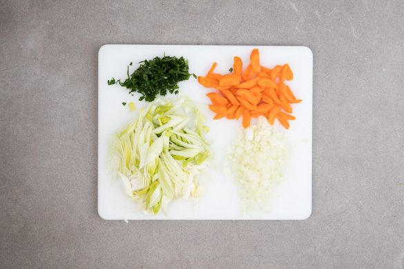 Die Karotte ggf. schälen, längs halbieren und schräg in dünne Scheiben schneiden. Den Lauch ebenfalls der Länge nach halbieren und schräg in feine Streifen schneiden. Die Zwiebel schälen, halbieren und fein würfeln. Die Petersilie samt Stängeln fein hacken.