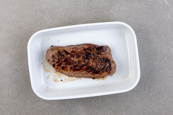 Das Fleisch trocken tupfen, mit Salz und Pfeffer würzen und in einer mittelgroßen Pfanne mit 1–2EL Olivenöl bei starker Hitze auf jeder Seite ca. 1Min. scharf anbraten. In eine Auflaufform geben und 5–6Min. im Ofen garen, bis das Fleisch den gewünschten Garpunkt erreicht hat. Tipp: Die Garzeit ist von der Dicke des Fleisches und dem gewünschten Garpunkt abhängig.