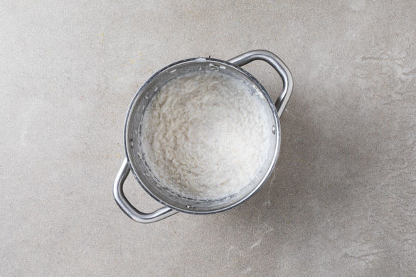 Den Reis in einem Sieb unter fließendem Wasser abspülen, bis das Wasser klar bleibt. Sobald das Kokoswasser kocht, den Reis darin einmal aufkochen lassen und dann bei niedrigster Hitze abgedeckt 10–12Min. kochen, bis der Reis die Flüssigkeit aufgesogen hat und bissfest ist. Noch ca. 5Min. abgedeckt ohne Hitzezufuhr ziehen lassen.