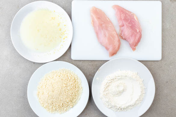 Auf einem tiefen Teller 4EL Weizenmehl bereitstellen. Auf einem zweiten Teller 3TL Senf mit 50ml Milch verrühren. Das Paniermehl auf einen dritten Teller geben. Das Fleisch trocken tupfen, horizontal halbieren und von beiden Seiten mit 1 kräftigen Prise Salz würzen.