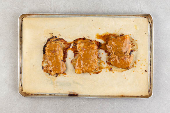 Das Backblech nach ca. 15Min. aus dem Ofen nehmen, das Fleisch wenden und mit der restlichen Fleischmarinade aus Schritt 3 bestreichen. Im Ofen weitere 5–10Min. backen, bis das Fleisch gar und appetitlich gebräunt ist.