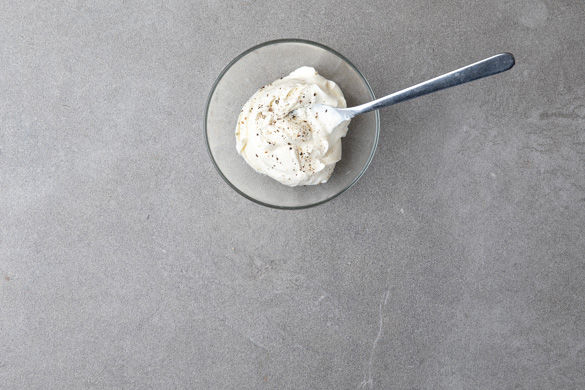 Die Crème fraîche mit Pfeffer abschmecken.