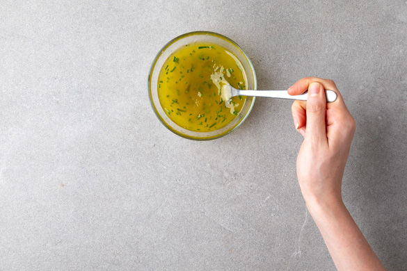 Währenddessen den Schnittlauch in feine Röllchen schneiden. Aus 1–2EL Olivenöl, 1–2EL Essig, 1–2EL Wasser sowie Salz und 1 Prise Zucker ein Dressing anrühren und den Schnittlauch untermischen.