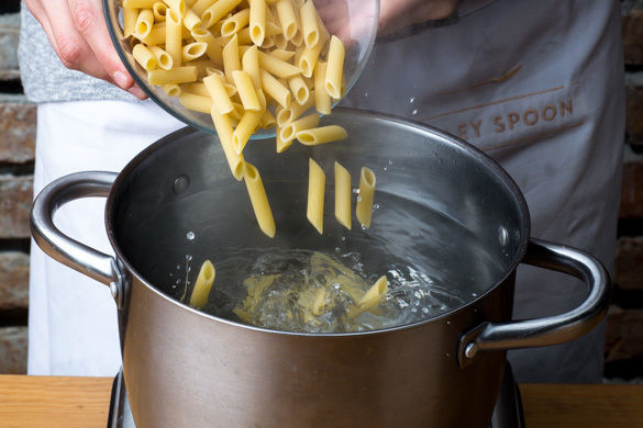 Die Pasta in das kochende Wasser geben und in 7–8Min. bissfest kochen. Mit einer Tasse ca. 100ml Pastawasser abschöpfen, dann die Nudeln in ein Sieb abgießen und abtropfen lassen.